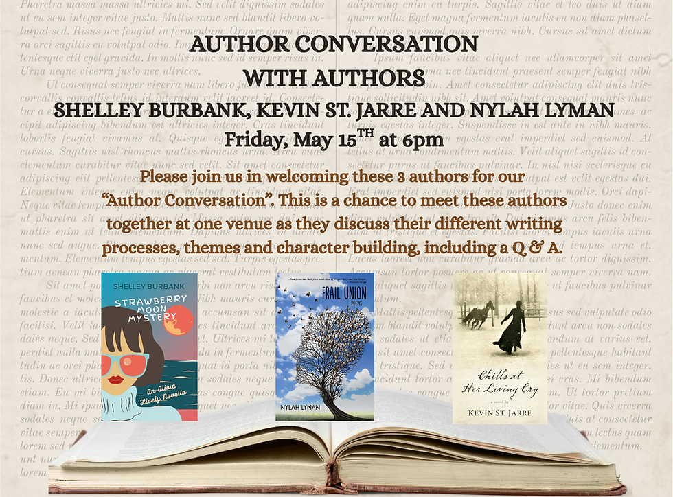 Shelley Burbank, Kevin St. Jarre and Nylah Lyman will be at the Limerick Public Library on Friday, May 15th at 6pm for a "Author Conversation". Please join us as they discuss their different writing processes, themes and character building. There will be a question an answer session.